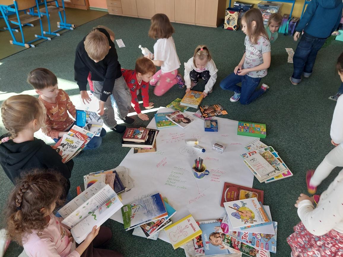 Po podzimních prázdninách nás ve školní knihovně přivítala paní knihovnice. Vysvětlila nám pravidla půjčování knih a hlavně jsme si o knihách nejen povídali, ale i jsme si je se zájmem prohlíželi. Řekli jsme si, jak se s knihami správně zachází a jaké druhy knih ve školní knihovně máme. Paní knihovnice potom dětem nabízela, jestli si raději chtějí prohlédnout a vybrat knihu s pohádkami, se zvířecím nebo dětským hrdinou nebo nějakou zajímavou encyklopedii. Každý z nás si nějakou knihu vybral a půjčil na domácí čtení a prohlížení.